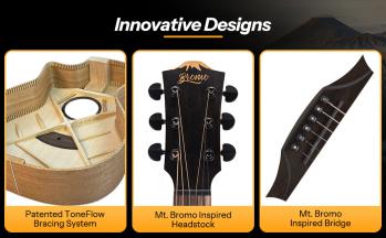 Introducing the Tahoma Series: Inspired by the majestic Tahoma volcano in the Pacific Ring of Fire, this collection is crafted for advanced players seeking unparalleled sound quality. The Tahoma Series boasts a solid top for exquisite tonal delivery. With a solid Sitka spruce top, the Bat 2 CE has articulate, clear tones and extended sustain. Our patented ToneFlow bracing system enhances resonance and richness, ensuring each note rings true. For those who perform live or record, the BAT 2CE Electric Acoustic model comes equipped with an under-saddle pickup and a three-band Bromo EQ with a built-in tuner, providing versatility and precision. Experience the pinnacle of craftsmanship and sound with the Tahoma Series.