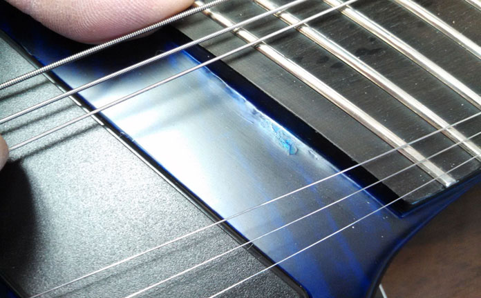 The Agile Intrepid Multi-Scale Guitar has a small finish defect where the body meets the neck.