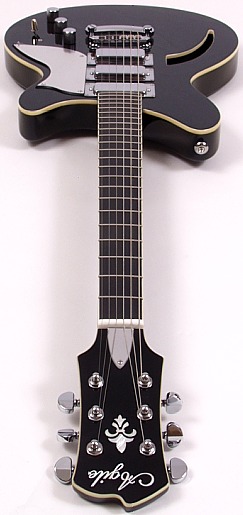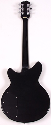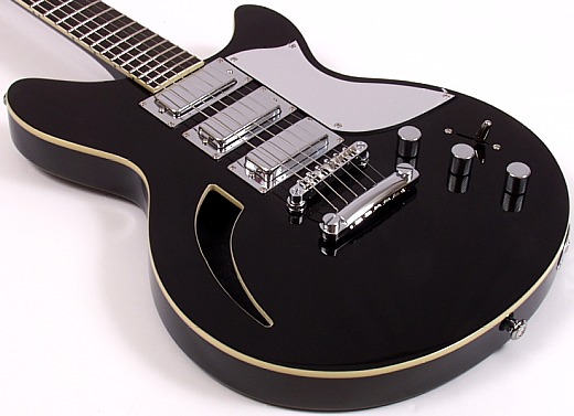 Semi-hollow Mahogany body and single crescent-shaped opening 22 fret Maple set neck with Ebony fret-board and bone nut