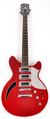 Semi-hollow Mahogany body and single crescent-shaped opening 22 fret Maple set neck with Ebony fret-board and graphite nut